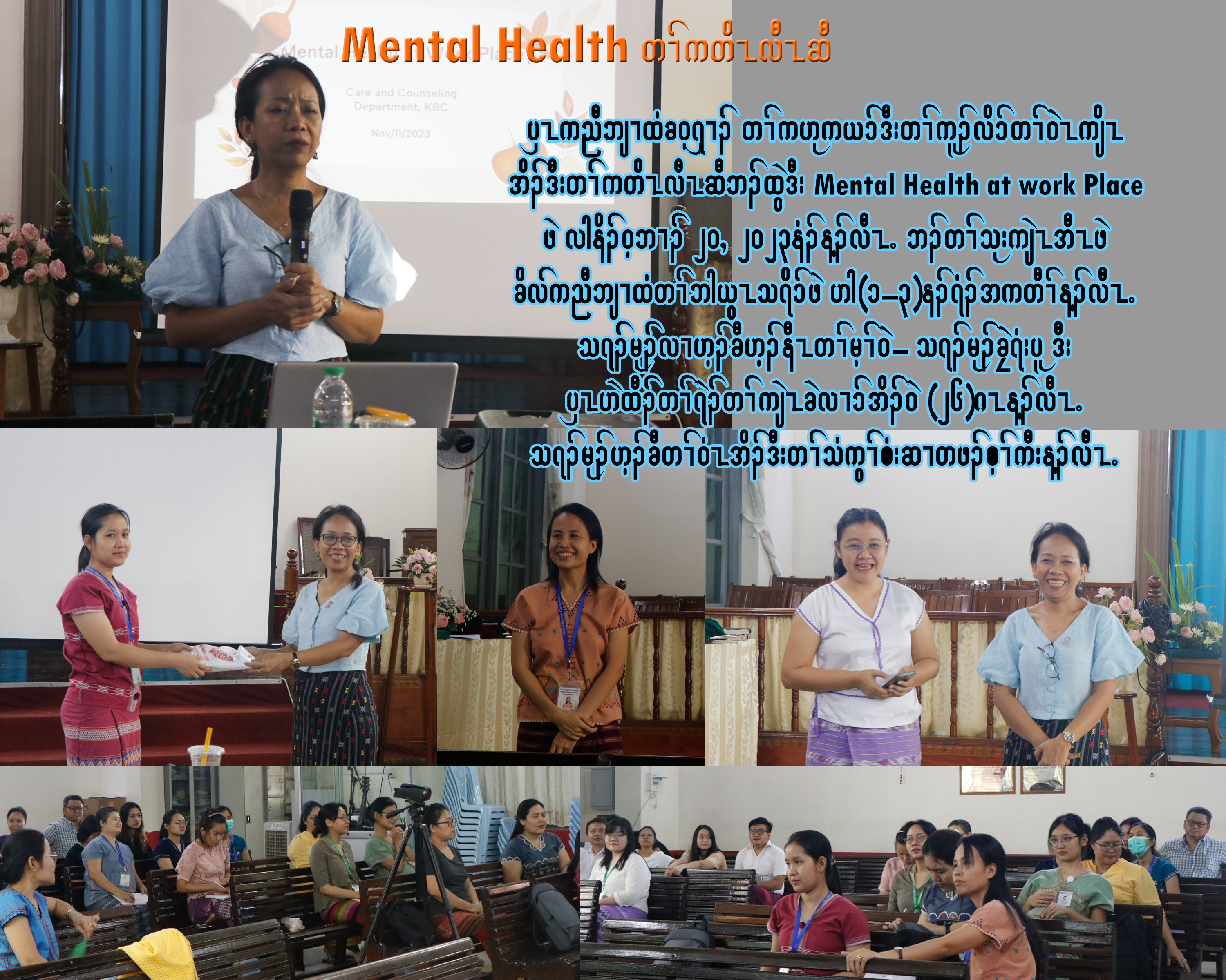 ၦၤကညီဘျၢထံခဝ့ၡၢၣ် တၢ်ကဟုကယ၁်ဒီးတၢ်ကူၣ်လိ၁်တၢ်ဝဲၤကျိၤ အိၣ်ဒီးတၢ်ကတိၤလီၤဆီဘၣ်ထွဲဒီး Mental Health at work Place  နဖဲ လါနိၣ်ဝ့ဘၢၣ် ၂ဝႇ ၂ဝ၂၃နံၣ်န့ၣ်လီၤ. ဘၣ်တၢ်သုးကျဲၤအီၤဖဲ ခိလ်ကညီဘျၢထံတၢ်ဘါယွၤသရိ၁်ဖဲ ဟါ(၁-၃)နၣ်ရံၣ်အကတီၢ်န့ၣ်လီၤ. သရၣ်မုၣ်လၢဟ့ၣ်ခီဟ့ၣ်နီၤတၢ်မ့ၢ်ဝဲ- သရၣ်မုၣ်ခၠဲရံးပူ ဒီး ၦၤဟဲထီၣ်တၢ်ရဲၣ်တၢ်ကျဲၤခဲလၢ၁်အိၣ်ဝဲ (၂၆)ဂၤန့ၣ်လီၤ.သရၣ်မုၣ်ဟ့ၣ်ခီတၢ်ဝံၤအိၣ်ဒီးတၢ်သံကွၢ်စံးဆၢတဖၣ်စ့ၢ်ကီးန့ၣ်လီၤ.