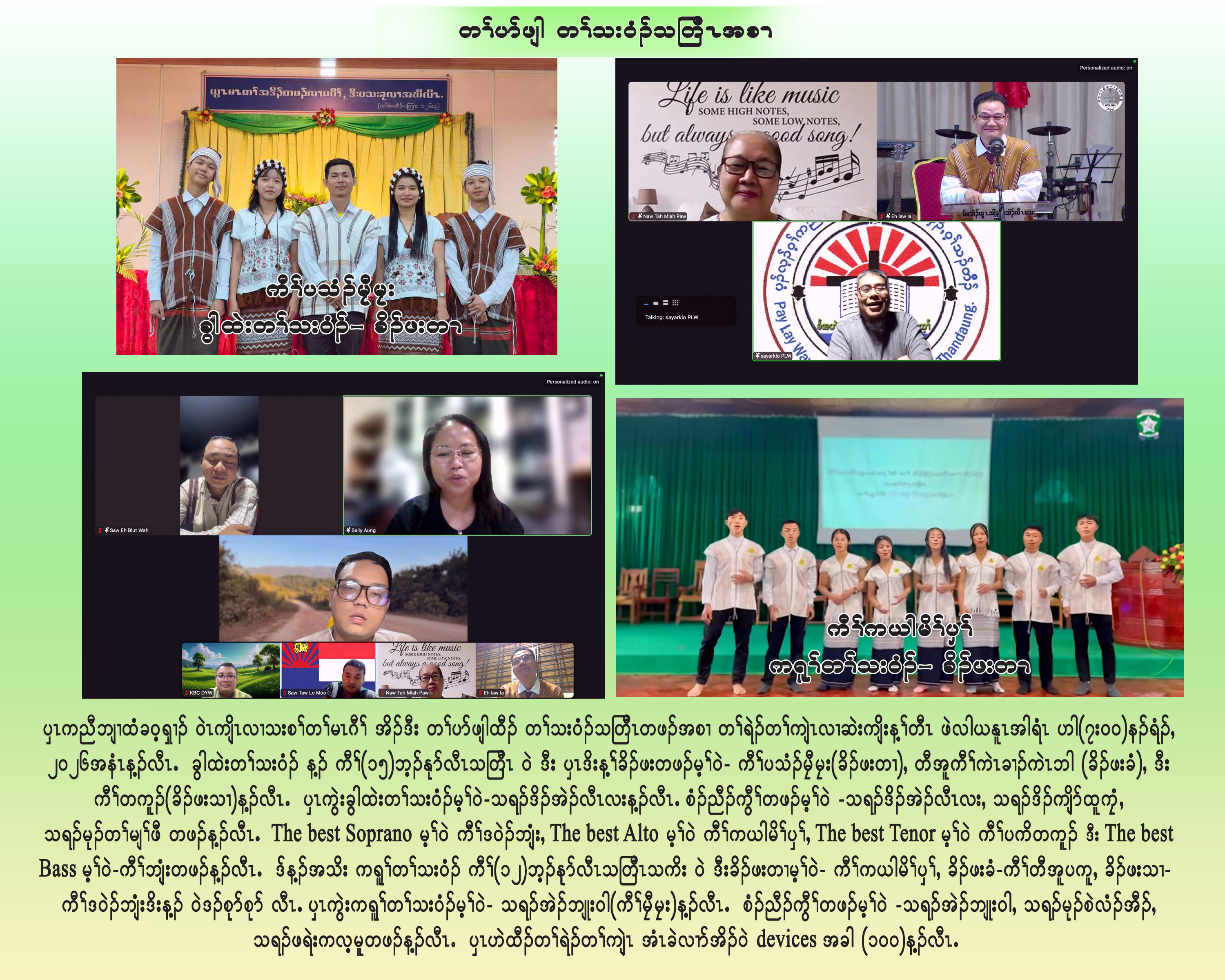 ဖဲ (၂၈.၃.၂ဝ၂၃ တုၤ ၂.၄.၂ဝ၂၃)နံၣ် သုးကျဲၤမၤဘၣ် ကီၢ်ကမျၢၢ်ခၢၣ်စးတၢ်အိၣ်ဖှိၣ်ဖဲ ဝ့ၢ်ပၠ့ၣ်အူလွ့ၣ်တၢ်အိၣ်ဖှိၣ်ႇ လၢတၢ်အိၣ်ဖှိၣ်ခၢၣ်စးလၢ ဟဲထီၣ်တၢ်အိၣ်ဖှိၣ်နီၣ်ဂံၢ်ခဲလၢ၁်အိၣ်ဝဲ (၁၅၅)ဂၤန့ၣ်လီၤ.ဖဲ (၂၃-၂၇.၅.၂ဝ၂၃)နံၣ် န့ၣ်ကီၢ်ခရံ၁်ဖိတၢ်ကူၣ်ဘၣ်ကူၣ်သ့ဝဲၤကျိၤ သုးကျဲၤမၤန့ၢ်ဘၣ်ဝဲ တၢ်သ့သိၣ်လိဖိသၣ်အိၣ်ဘှံးနံၤတၢ်မၤလိလၢ ဆဲးကျိးန့ၢ်တီၤအဖီခိၣ် သရၣ်မုၣ်တဖၣ်လၢဟဲထီၣ် မၤလိတၢ်ဒ်တၢ်အိၣ်ဖှိၣ်ခၢၣ်စးခဲလၢ၁်အိၣ်(၁၁)ဂၤဒီး သရၣ်မုၣ်သိၣ်လိတၢ်(၂)ဂၤန့ၣ်လီၤ.တၢ်တိ၁်ထူ - အနာဂတ်ခေါင်းဆောင်အတွက်ဓမ္မပန်းပျိုးသောလက်  (၂မိၤရှ့ ၁၈း၂ဝႇ မးသဲ ၂၈း၂ဝ)