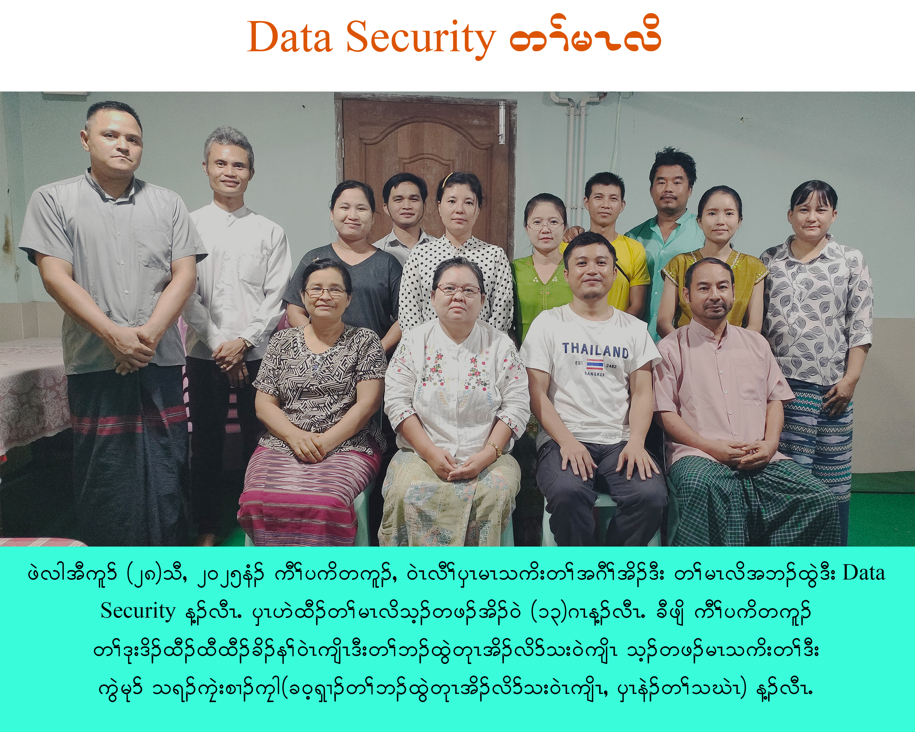 ဖဲလါအီကူ၁် (၂၈)သီႇ ၂ဝ၂၅နံၣ် ကီၢ်ပကိတကူၣ်ႇ ဝဲၤလီၢ်ၦၤမၤသကိးတၢ်အဂီၢ်အိၣ်ဒီး တၢ်မၤလိအဘၣ်ထွဲဒီး Data Security န့ၣ်လီၤ. ၦၤဟဲထီၣ်တၢ်မၤလိသ့ၣ်တဖၣ်အိၣ်ဝဲ (၁၃)ဂၤန့ၣ်လီၤ. ခီဖျိ ကီၢ်ပကိတကူၣ် တၢ်ဒုးဒိၣ်ထီၣ်ထီထီၣ်ခိၣ်နၢ်ဝဲၤကျိၤဒီးတၢ်ဘၣ်ထွဲတုၤအိၣ်လိ၁်သးဝဲကျိၤ သ့ၣ်တဖၣ်မၤသကိးတၢ်ဒီး ကွဲမု၁် သရၣ်ကၠဲးစၢၣ်ကၠါ(ခဝ့ၡၢၣ်တၢ်ဘၣ်ထွဲတုၤအိၣ်လိ၁်သးဝဲၤကျိၤႇ ၦၤနဲၣ်တၢ်သဃဲၤ) န့ၣ်လီၤ. စိၤဆၢကတီၢ်ခဲအံၤ တၢ်လၢကမၤလီၤပှီၢ်ကွံ၁်ၦၤကျဲတဘိလၢအမ့ၢ် တၢ်ဟုၣ်န့ၢ်ပတၢ်လၢ Online နတကပၤန့ၣ် အိၣ်ဝဲဒၣ်အါမးအဃိ ပနီၢ်ကစၢ်မ့ၢ်ဂ့ၤႇ ပတၢ်ကရၢကရိအဂီၢ်မ့ၢ်ဂ့ၤန့ၣ် ပဘၣ်အိၣ်ဒီးတၢ်ပလီၢ်ပဒီပသးလၢ တၢ်သူတၢ် ပီးတၢ်လီသ့ၣ်တဖၣ်အဖီခိၣ်န့ၣ် မ့ၢ်တၢ်ဟ့ၣ်ဒုးပလီၢ်အကျိၤအကျဲသ့ၣ်တဖၣ် လၢၦၤဟံးန့ၢ်ပတၢ်န့ၢ်သါကသ့ဒ်လဲၣ် သ့ၣ်တဖၣ်န့ၣ်လီၤ. ၦၤထီၣ်တၢ်မၤလိသ့ၣ်တဖၣ်အိၣ်ဒီး တၢ်ဟ့ၣ်ခီဟ့ၣ်နီၤလိ၁်သးတၢ်လဲၤခီဖျိသ့ၣ်တဖၣ်စ့ၢ်ကီး န့ၣ်လီၤ.