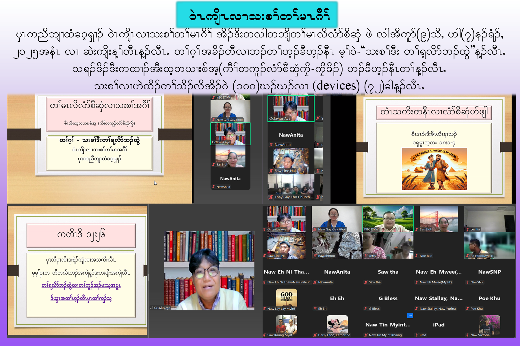ၦၤကညီဘျၢထံခဝ့ၡၢၣ် တၢ်သးခုကစီၣ်ဒီးမံးၡၢၣ်ဝဲၤကျိၤ အိၣ်ဒီးတၢ်မၢဖိတၢ်မၤလိ(၆)ဘျီတဘျီ လါအီကူာ်(၄)သီ တုၤ (၂၂)သီႇ ၂ဝ၂၅နံၣ်ဖဲ  ကီၢ်တကူၣ်ကျဲးစၢးကရၢတၢ်သူၣ်ထီၣ်န့ၣ်လီၤ. တၢ်မၤလိတဘျီအံၤ တၢ်သိၣ်လိလၢ ဘၣ်တၢ်ဟ့ၣ်ခီဟ့ၣ်နီၤအီၤတဖၣ်မ့ၢ်ဝဲ- တၢ်မၤလိလံာ်စီဆှံ-သရၣ်မုၣ်ရံနၣ်ဖီႇ သရၣ်ဒီးကထၢၣ်န့ၢ်လ့အီၣ်ႇ သရၣ်မုၣ်သီအဲၣ်ႇ ''တၢ်အုၣ်က့ၤခီၣ်က့ၤ'' လၢ သရၣ်ဒိၣ်ဖိထူႇ ''CCMP'' လၢ သရၣ်ဒိၣ်လးဖ့ၣ်ႇ  ''တၢ်သးခုကစီၣ်အကျဲကူၣ်နၢၤ'' လၢ သရၣ်ဒိၣ်မ့အီၣ်ထိႇ ''မုၢ်နံၤခံကတၢၢ်တၢ်ကမၤအသးတဖၣ်''လၢ သရၣ်ဒိၣ်တ့ၣ်စီႇ ''နံၣ်ကယၤ(၂၁)တၢ်တၤဒီး တၢ်မၤတၢ်သးခုကစီၣ်တၢ်မၤ'' လၢ သရၣ်မုၣ်ဒီးကထၢၣ်တ့ၣ်စံၣ်မိႇ ''နီၢ်တဂၤတၢ်မၤတၢ်သးခုကစီၣ်'' လၢ သရၣ်လွါမိထဲးအီၣ်ႇ ''Praise and Worship'' လၢသရၣ်သးဂ့ၤကိလ်တဖၣ်န့ၣ်လီၤ. ကီၢ်(၁၁)ဘ့ၣ်ခၢၣ်စး ၦၤဟဲထီၣ်အိၣ်ဝဲ(၁၅)ဂၤန့ၣ်လီၤ.