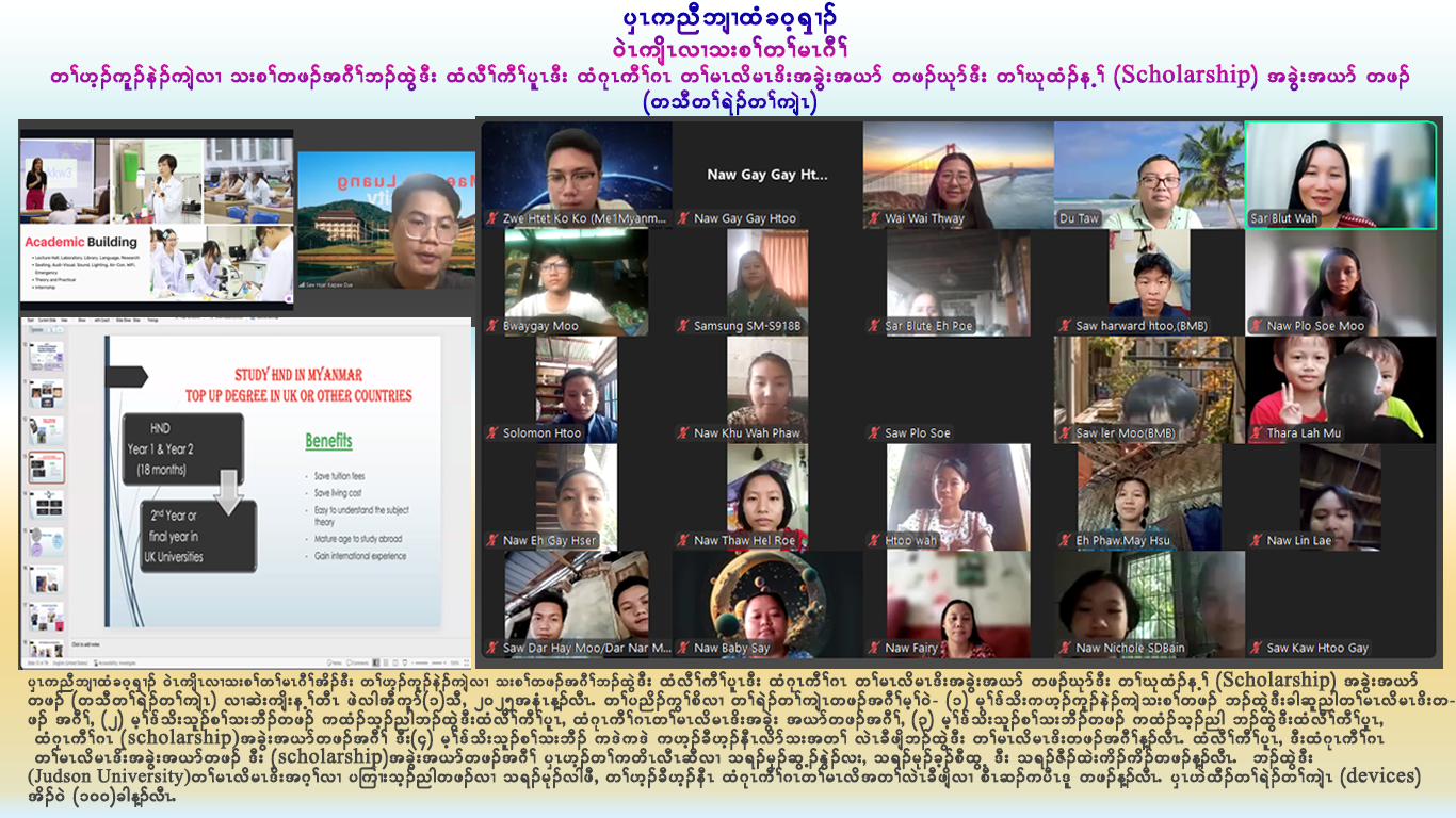 ၦၤကညီဘျၢထံခဝ့ၡၢၣ် ဝဲၤကျိၤလၢသးစၢ်တၢ်မၤဂီၢ်အိၣ်ဒီး တၢ်ဟ့ၣ်ကူၣ်နဲၣ်ကျဲလၢ သးစၢ်တဖၣ်အဂီၢ်ဘၣ်ထွဲဒီး ထံလီၢ်ကီၢ်ပူၤဒီး ထံဂုၤကီၢ်ဂၤ တၢ်မၤလိမၤဒိးအခွဲးအယာ်တဖၣ်ဃုာ်ဒီး တၢ်ဃုထံၣ်န့ၢ် (Scholarship) အခဲွးအယာ် တဖၣ်(တသီတၢ်ရဲၣ်တၢ်ကျဲၤ) လၢဆဲးကျိးန့ၢ်တီၤ ဖဲလါအီကူာ်(၁)သီႇ ၂ဝ၂၅အနံၤန့ၣ်လီၤ. တၢ်ပညိၣ်ကွၢ်စိလၢ တၢ်ရဲၣ်တၢ်ကျဲၤတဖၣ်အဂီၢ်မ့ၢ်ဝဲ- (၁) မ့ၢ်ဒ်သိးကဟ့ၣ်ကူၣ်နဲၣ်ကျဲသးစၢ်တဖၣ် ဘၣ်ထဲဒွီးခါဆူညါတၢ်မၤလိမၤဒိးတဖၣ် အဂီၢ်ႇ (၂) မ့ၢ်ဒ်သိးသူၣ်စၢ်သးဘီၣ်တဖၣ် ကထံၣ်သ့ၣ်ညါဘၣ်ထဲဒွီးထံလီၢ်ကီၢ်ပူၤႇ ထံဂုၤကီၢ်ဂၤတၢ်မၤလိမၤဒိးအခဲွး အယာ်တဖၣ်အဂီၢ်ႇ (၃) မ့ၢ်ဒ်သိးသူၣ်စၢ်သးဘီၣ်တဖၣ် ကထံၣ်သ့ၣ်ညါ ဘၣ်ထဲဒွီးထံလီၢ်ကီၢ်ပူၤႇ ထံဂုၤကီၢ်ဂၤ (Scholarship)အခွဲးအယာ်တဖၣ်အဂီၢ် ဒီး(၄) မ့ၢ်ဒ်သိးသူၣ်စၢ်သးဘီၣ် ကဒဲကဒဲ ကဟ့ၣ်ခီဟ့ၣ်နီၤလိာ်သးအတၢ် လဲၤခီဖျိဘၣ်ထဲဒွီး တၢ်မၤလိမၤဒိးတဖၣ်အဂီၢ်န့ၣ်လီၤ. ထံလီၢ်ကီၢ်ပူၤႇ ဒီးထံဂုၤကီၢ်ဂၤ တၢ်မၤလိမၤဒိးအခဲွးအယာ်တဖၣ် ဒီး (Scholarship)အခွဲးအယာ်တဖၣ်အဂီၢ် ၦၤဟ့ၣ်တၢ်ကတိၤလီၤဆီလၢ သရၣ်မုၣ်ဆွ့ၣ်နွဲၣ်လးႇ သရၣ်မုၣ်ခ့ၣ်စီထွ့ ဒီး သရၣ်ဇီၣ်ထဲးကိၣ်ကိၣ်တဖၣ်န့ၣ်လီၤ.  ဘၣ်ထဲဒွီး (Judson University)တၢ်မၤလိမၤဒိးအဂ့ၢ်လၢ ပကြၢးသ့ၣ်ညါတဖၣ်လၢ သရၣ်မုၣ်လါဖီႇ တၢ်ဟ့ၣ်ခီဟ့ၣ်နီၤ ထံဂုၤကီၢ်ဂၤတၢ်မၤလိအတၢ်လဲၤခီဖျိလၢ စီၤဆၣ်ကပီၤဒူ တဖၣ်န့ၣ်လီၤ. ၦၤဟဲထီၣ်တၢ်ရဲၣ်တၢ်ကျဲၤ (devices)အိၣ်ဝဲ (၁ဝဝ)ခါန့ၣ်လီၤ.