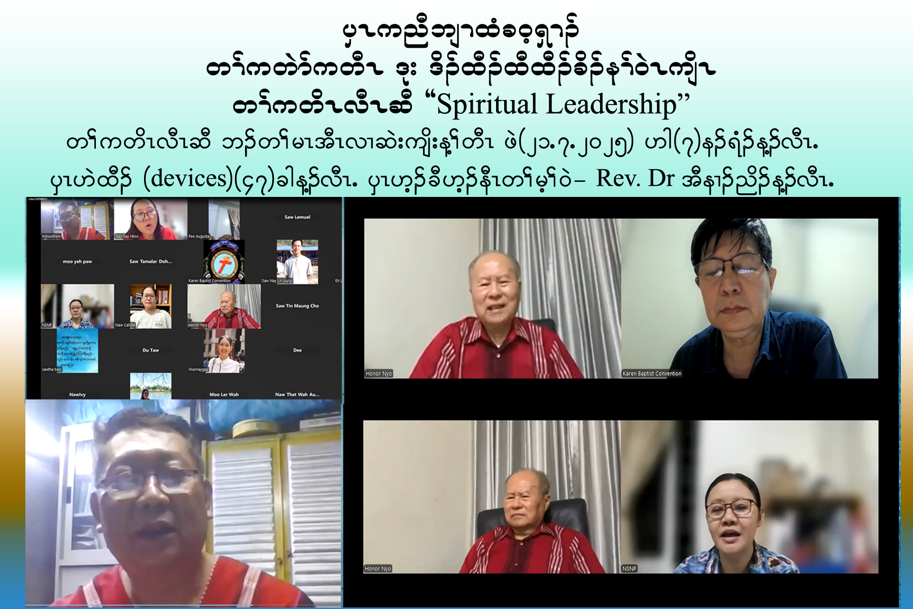 ၦၤကညီဘျၢထံခဝ့ၡၢၣ် တၢ်ကတဲာ်ကတီၤဒုးဒိၣ်ထီၣ်ထီထီၣ်ခိၣ်နၢ်ဝဲၤကျိၤအိၣ်ဒီး တၢ်ကတိၤလီၤဆီဘၣ်ထဲဒွီး ''Spiritual Leadership" တၢ်ရဲၣ်တၢ်ကျဲၤဖဲ လါယူၤလံ(၂၁), ၂ဝ၂၅အနံၤ ဟါ(၇)နၣ်ရံၣ်လၢဆဲးကျိးန့ၢ်တီၤန့ၣ်လီၤ. ၦၤဟ့ၣ်ခီဟ့ၣ်နီၤတၢ်မ့ၢ်ဝဲ သရၣ်ဒိၣ်ဒီးကထၢၣ်အီနၢၣ်ညိၣ်(ခဝ့ၡၢၣ်နဲၣ်ရွဲၣ် မၤတ့ၢ်တၢ်)န့ၣ်လီၤ. တၢ်ဟ့ၣ်ထီၣ်ဝံၤ ပိာ်ထဲထွီၣ်အခံလၢ တၢ်သံကွၢ်စံးဆၢတဖၣ်န့ၣ်လီၤ. ၦၤဟဲထီၣ်တၢ်ရဲၣ်တၢ်ကျဲၤအံၤလၢ (devices) ခဲလၢာ်အိၣ်ဝဲ(၄၇)ခါန့ၣ်လီၤ.