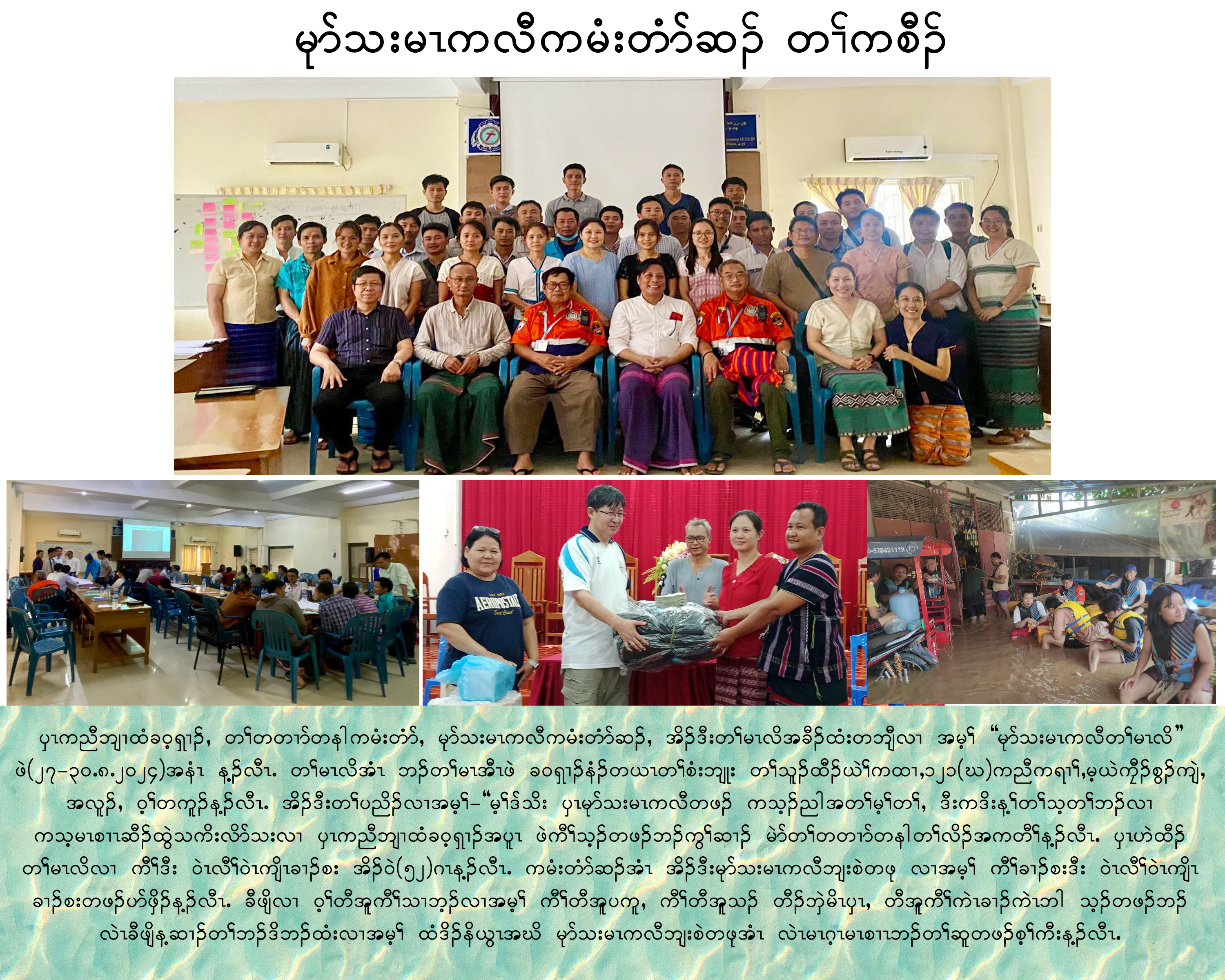 ၦၤကညီဘျၢထံခဝ့ၡၢၣ်ႇ တၢ်တတၢာ်တနါကမံးတံာ်ႇ မုာ်သးမၤကလီကမံးတံာ်ဆၣ်ႇ အိၣ်ဒီးတၢ်မၤလိအခီၣ်ထံးတဘျီလၢ အမ့ၢ် ''မုာ်သးမၤကလီတၢ်မၤလိ" ဖဲ(၂၇-၃ဝ.၈.၂ဝ၂၄)အနံၤန့ၣ်လီၤ. တၢ်မၤလိအံၤ ဘၣ်တၢ်မၤအီၤဖဲ ခဝ့ၡၢၣ်နံၣ် တယၤတၢ်စံးဘျုး တၢ်သူၣ်ထီၣ်ယဲၢ်ကထၢႇ ၁၂၁(ဃ)ကညီကရၢၢ်ႇ မ့ယဲကၠီၣ်စွၣ်ကျဲႇ အလူၣ်ႇ ဝ့ၢ်တကူၣ်န့ၣ်လီၤ.အိၣ် ဒီးတၢ်ပညိၣ်လၢအမ့ၢ်-မ့ၢ်ဒ်သိး ၦၤမုာ်သးမၤကလီတဖၣ် ကသ့ၣ်ညါအတၢ်မ့ၢ်တၢ်ႇ ဒီးကဒိးန့ၢ်တၢ်သ့တၢ်ဘၣ်လၢ ကသ့မၤစၢၤဆီၣ်ထွဲသကိးလိာ်သးလၢ ၦၤကညီဘျၢထံခဝ့ၡၢၣ်အပူၤ ဖဲကီၢ်သ့ၣ်တဖၣ်ဘၣ်ကွၢ်ဆၢၣ်မဲာ်တၢ် တတၢာ် တနါတၢ်လိၣ်အကတီၢ်န့ၣ်လီၤ. တၢ်မၤလိတဘျီအံၤ ၦၤသိၣ်လိလံာ်စီဆှံမ့ၢ်ဝဲ သရၣ်ဒိၣ်ဒီးကထၢၣ်ကၠိစဲး(MIT), ၦၤသိၣ်လိ Disaster Management -သရၣ်သဲးပဲၣ်ဖၠိ(Tear Fund), Volunteer Spirit လၢ သရၣ်ဒိၣ်ခၢးဘၢၣ်ဝ့ႇ သရၣ်ရံးခၠဲးႇ Volunteer Ethic & Duty လၢ သရၣ်ဒိၣ်ဒီးကထၢၣ်သီတူၢ်ထူ ဒီး ၦၤကွၢ်ထဲတွၢ်ကွၢ်ကဒါက့ၤမ့ၢ်ဝဲ သရၣ်လဲမယၢၣ်န့ၣ်လီၤ.ၦၤဟဲထီၣ်တၢ်မၤလိလၢ ကီၢ်ဒီး ဝဲၤလီၢ်ဝဲၤကျိၤခၢၣ်စး အိၣ်ဝဲ(၅၂)ဂၤန့ၣ်လီၤ.