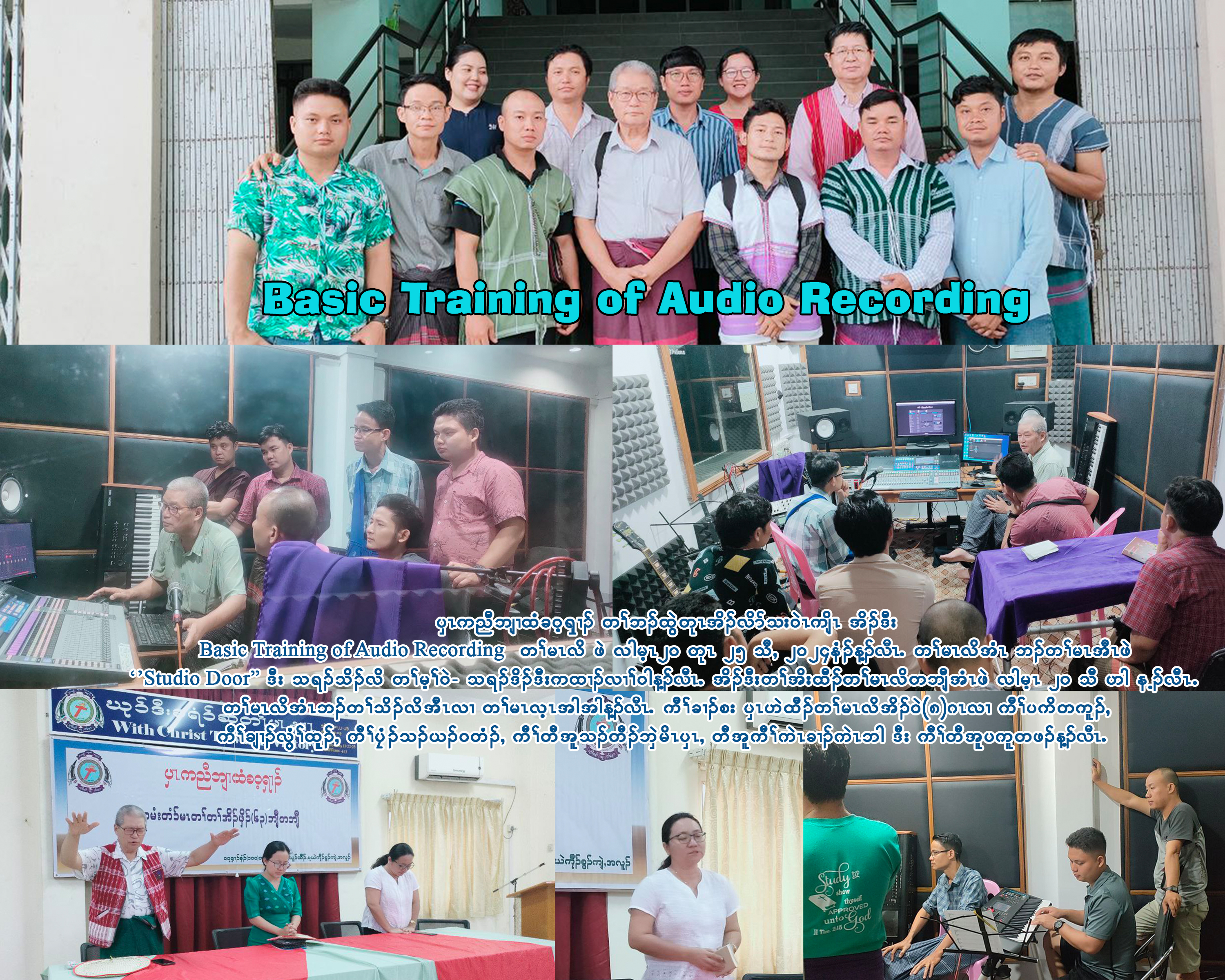 ၦၤကညီဘျၢထံခဝ့ၡၢၣ် တၢ်ဘၣ်ထဲတွုၤအိၣ်လိာ်သးဝဲၤကျိၤ အိၣ်ဒီး Basic Training of Audio Recording  တၢ်မၤလိ ဖဲ လါမ့ၤ၂ ဝတုၤ ၂၅ သီႇ ၂ဝ၂၄နံၣ်န့ၣ်လီၤ. တၢ်မၤလိအံၤ ဘၣ်တၢ်မၤအီၤဖဲ "Studio Door" ဒီး သရၣ်သိၣ်လိ တၢ်မ့ၢ်ဝဲ- သရၣ်ဒိၣ်ဒီးကထၢၣ်လၢၢ်ဝါန့ၣ်လီၤ. အိၣ်ဒီးတၢ်အိးထီၣ်တၢ်မၤလိတဘျီအံၤဖဲ လါမ့ၤ ၂ ဝသီ ဟါ န့ၣ်လီၤ.တၢ်မၤလိအံၤဘၣ်တၢ်သိၣ်လိအီၤလၢ တၢ်မၤလ့ၤအါအါန့ၣ်လီၤ. ကီၢ်ခၢၣ်စး ၦၤဟဲထီၣ်တၢ်မၤလိအိၣ်ဝဲ(၈)ဂၤလၢ ကီၢ်ပကိတကူၣ်ႇ ကီၢ်ချၢၣ်လွံၢ်ထူၣ်ႇ ကီၢ်ပၠံၣ်သၣ်ယၣ်ဝတံၣ်ႇ ကီၢ်တီအူသၣ်တီၣ်ဘှဲမိၤၦၤႇ တီအူကီၢ်ကဲၤခၢၣ်ကဲၤဘါ ဒီး ကီၢ်တီအူပကူတဖၣ်န့ၣ်လီၤ.