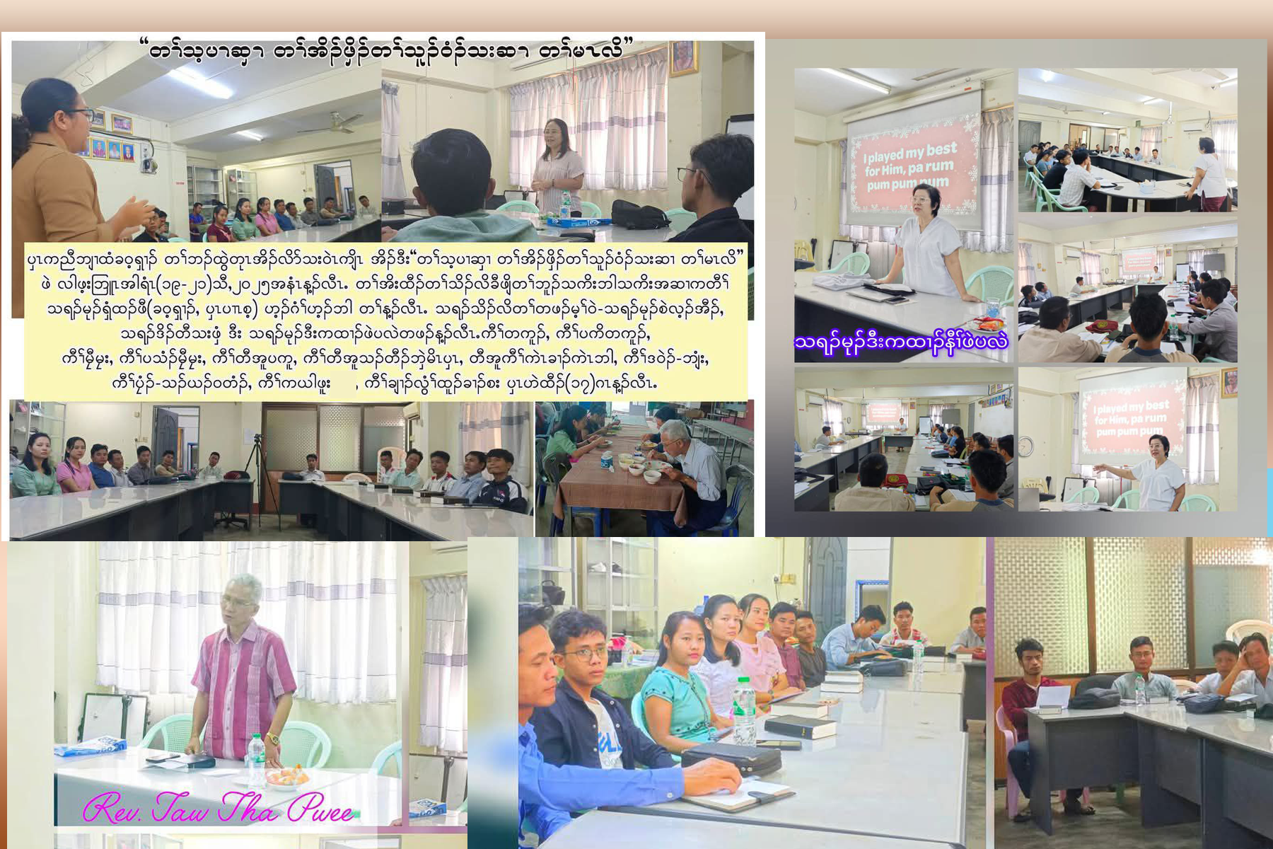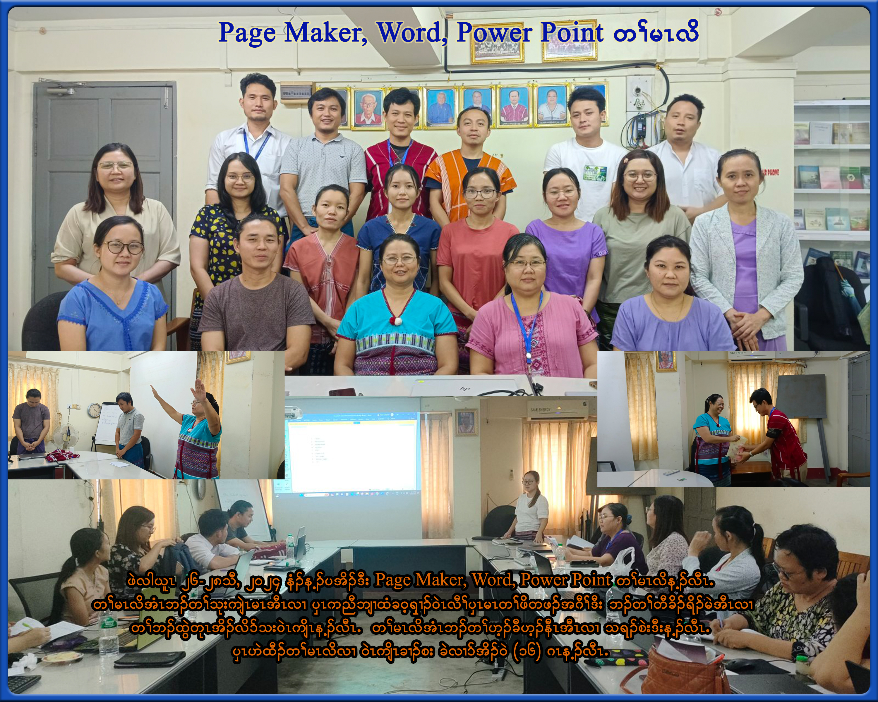 ဖဲလါယူၤ ၂၆-၂၈သီႇ ၂ဝ၂၄ နံၣ်န့ၣ်ပအိၣ်ဒီး Page Maker, Word, Power Point အတၢ်မၤလိန့ၣ်လီၤ. တၢ်မၤလိအံၤဘၣ်တၢ်သုးကျဲၤမၤအီၤလၢ ၦၤကညီဘျၢထံခဝ့ၡၢၣ်ဝဲၤလီၢ်ၦၤမၤတၢ်ဖိတဖၣ်အဂီၢ်ဒီး ဘၣ်တၢ်တီခိၣ်ရိၣ်မဲအီၤလၢ တၢ်ဘၣ်ထွဲတုၤအိၣ်လိ၁်သးဝဲၤကျိၤန့ၣ်လီၤ. တၢ်မၤလိအံၤဘၣ်တၢ်ဟ့ၣ်ခီဟ့ၣ်နီၤအီၤလၢ သရၣ်စဲးဒီးန့ၣ်လီၤ. ၦၤဟဲထီၣ်တၢ်မၤလိလၢ ဝဲၤကျိၤခၢၣ်စး ခဲလၢ၁်အိၣ်ဝဲ (၁၆) ဂၤန့ၣ်လီၤ.