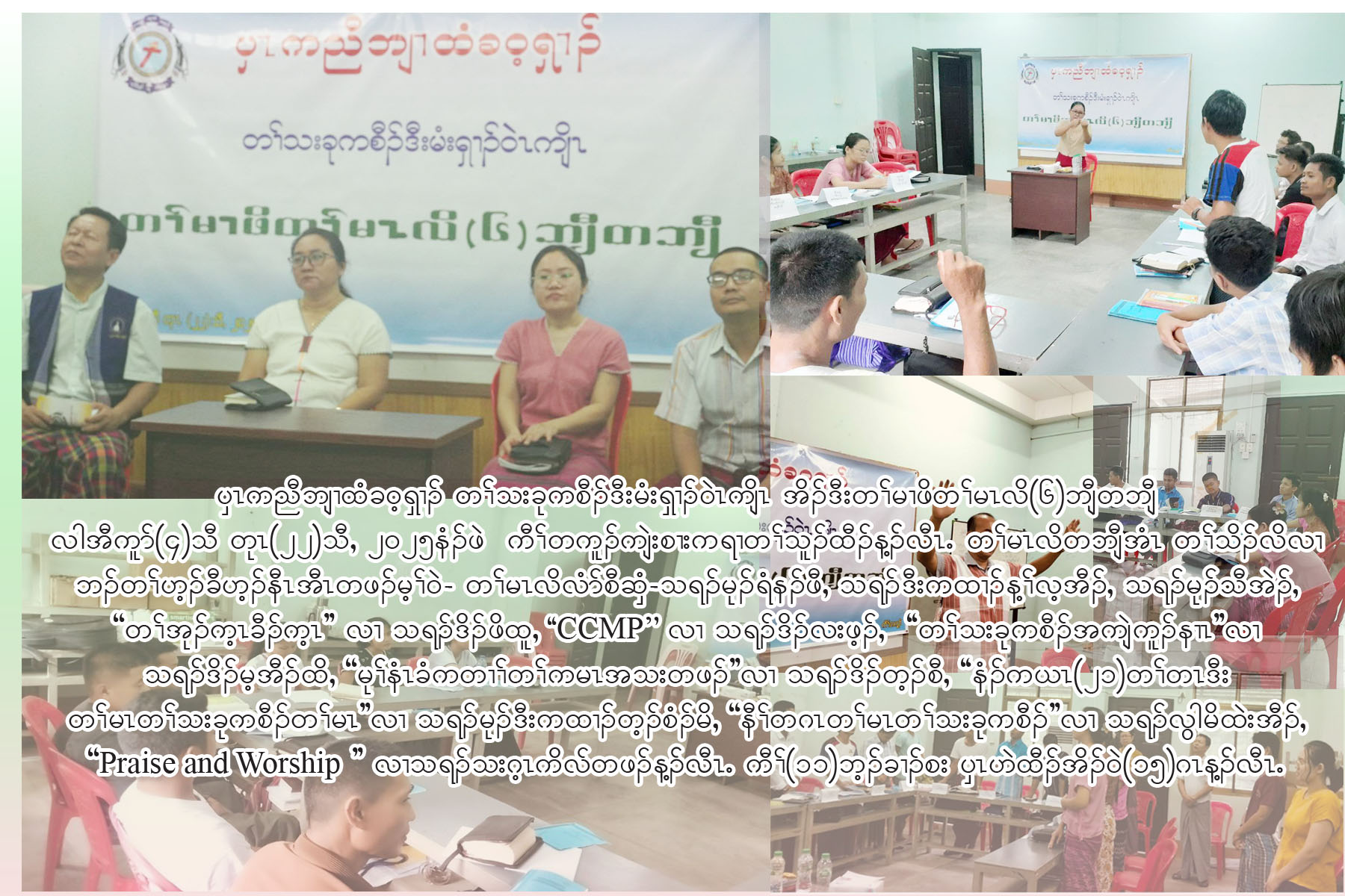 ၦၤကညီဘျၢထံခဝ့ၡၢၣ် တၢ်သးခုကစီၣ်ဒီးမံးၡၢၣ်ဝဲၤကျိၤ အိၣ်ဒီးတၢ်မၢဖိတၢ်မၤလိ(၆)ဘျီတဘျီ လါအီကူာ်(၄)သီ တုၤ (၂၂)သီႇ ၂ဝ၂၅နံၣ်ဖဲ  ကီၢ်တကူၣ်ကျဲးစၢးကရၢတၢ်သူၣ်ထီၣ်န့ၣ်လီၤ. တၢ်မၤလိတဘျီအံၤ တၢ်သိၣ်လိလၢ ဘၣ်တၢ်ဟ့ၣ်ခီဟ့ၣ်နီၤအီၤတဖၣ်မ့ၢ်ဝဲ- တၢ်မၤလိလံာ်စီဆှံ-သရၣ်မုၣ်ရံနၣ်ဖီႇ သရၣ်ဒီးကထၢၣ်န့ၢ်လ့အီၣ်ႇ သရၣ်မုၣ်သီအဲၣ်ႇ ''တၢ်အုၣ်က့ၤခီၣ်က့ၤ'' လၢ သရၣ်ဒိၣ်ဖိထူႇ ''CCMP'' လၢ သရၣ်ဒိၣ်လးဖ့ၣ်ႇ  ''တၢ်သးခုကစီၣ်အကျဲကူၣ်နၢၤ'' လၢ သရၣ်ဒိၣ်မ့အီၣ်ထိႇ ''မုၢ်နံၤခံကတၢၢ်တၢ်ကမၤအသးတဖၣ်''လၢ သရၣ်ဒိၣ်တ့ၣ်စီႇ ''နံၣ်ကယၤ(၂၁)တၢ်တၤဒီး တၢ်မၤတၢ်သးခုကစီၣ်တၢ်မၤ'' လၢ သရၣ်မုၣ်ဒီးကထၢၣ်တ့ၣ်စံၣ်မိႇ ''နီၢ်တဂၤတၢ်မၤတၢ်သးခုကစီၣ်'' လၢ သရၣ်လွါမိထဲးအီၣ်ႇ ''Praise and Worship'' လၢသရၣ်သးဂ့ၤကိလ်တဖၣ်န့ၣ်လီၤ. ကီၢ်(၁၁)ဘ့ၣ်ခၢၣ်စး ၦၤဟဲထီၣ်အိၣ်ဝဲ(၁၅)ဂၤန့ၣ်လီၤ.