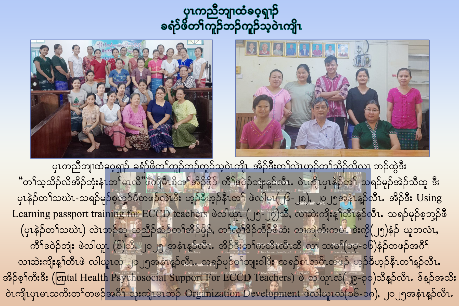 ၦၤကညီဘျၢထံခဝ့ၡၢၣ် ခရံာ်ဖိတၢ်ကူၣ်ဘၣ်ကူၣ်သ့ဝဲၤကျိၤ အိၣ်ဒီးတၢ်လဲၤဟ့ၣ်တၢ်သိၣ်လိလၢ ဘၣ်ထွဲတၢ်သ့သိၣ်လိအိၣ်ဘှံးနံၤတၢ်မၤလိ ဖဲကျီမီၤစိတၢ်အိၣ်ဖှိၣ် ကီၢ်ဒဝဲၣ်ဘျံးန့ၣ်လီၤ. ဝဲၤကျိၤၦၤနဲၣ်တၢ်-သရၣ်မုၣ်အဲၣ်သီထူ ဒီး ၦၤနဲၣ်တၢ်သဃဲၤ-သရၣ်မုၣ်စ့ဘှ့ၣ်ဖီတဖၣ်လဲၤဒီး ဟ့ၣ်ခီဟ့ၣ်နီၤတၢ် ဖဲလါမ့ၤ(၂၆-၂၈)ႇ ၂ဝ၂၅အနံၤန့ၣ်လီၤ. အိၣ်ဒီး Using Learning passport training for ECCD teachers ဖဲလါယူၤ (၂၅-၂၇)သီႇ လၢဆဲးကျိးန့ၢ်တီၤန့ၣ်လီၤ. သရၣ်မုၣ်စ့ဘှ့ၣ်ဖီ(ၦၤနဲၣ်တၢ်သဃဲၤ) လဲၤဘၣ်ဆူ သညီၣ်ဆံၣ်တၢ်အိၣ်ဖှိၣ်ႇ တၢ်လုၢ်ဒိၣ်ထီၣ်ဖိဆံး လၢကျဲကိးကပၤ ဒဲးကၠိ(၂၅)နံၣ် ယူဘလံၤႇ ကီၢ်ဒဝဲၣ်ဘျံး ဖဲလါယူၤ (၆)သီႇ ၂ဝ၂၅ အနံၤန့ၣ်လီၤ. အိၣ်ဒီးတၢ်ကတိၤလီၤဆီ လၢ သးစၢ်(၁၃-၁၆)နံၣ်တဖၣ်အဂီၢ် လၢဆဲးကျိးန့ၢ်တီၤဖဲ လါယူၤလံ ၂ဝ၂၅အနံၤန့ၣ်လီၤ. သရၣ်မုၣ်စၢ်ဘျုးဝါဒီး သရၣ်စၤလမိၤတဖၣ် ဟ့ၣ်ခီဟ့ၣ်နီၤတၢ်န့ၣ်လီၤ. အိၣ်စ့ၢ်ကီးဒီး Mental Health Psycho social Support For ECCD Teachers)) ဖဲ လါယူၤလံ(၂၉-၃၁)သီန့ၣ်လီၤ. ဒ်န့ၣ်အသိး ဝဲၤကျိၤၦၤမၤသကိးတၢ်တဖၣ်အဂီၢ် သုးကျဲၤမၤဘၣ် Organization Development အဖဲလါယူၤလံ(၁၆-၁၈)ႇ ၂ဝ၂၅အနံၤန့ၣ်လီၤ.