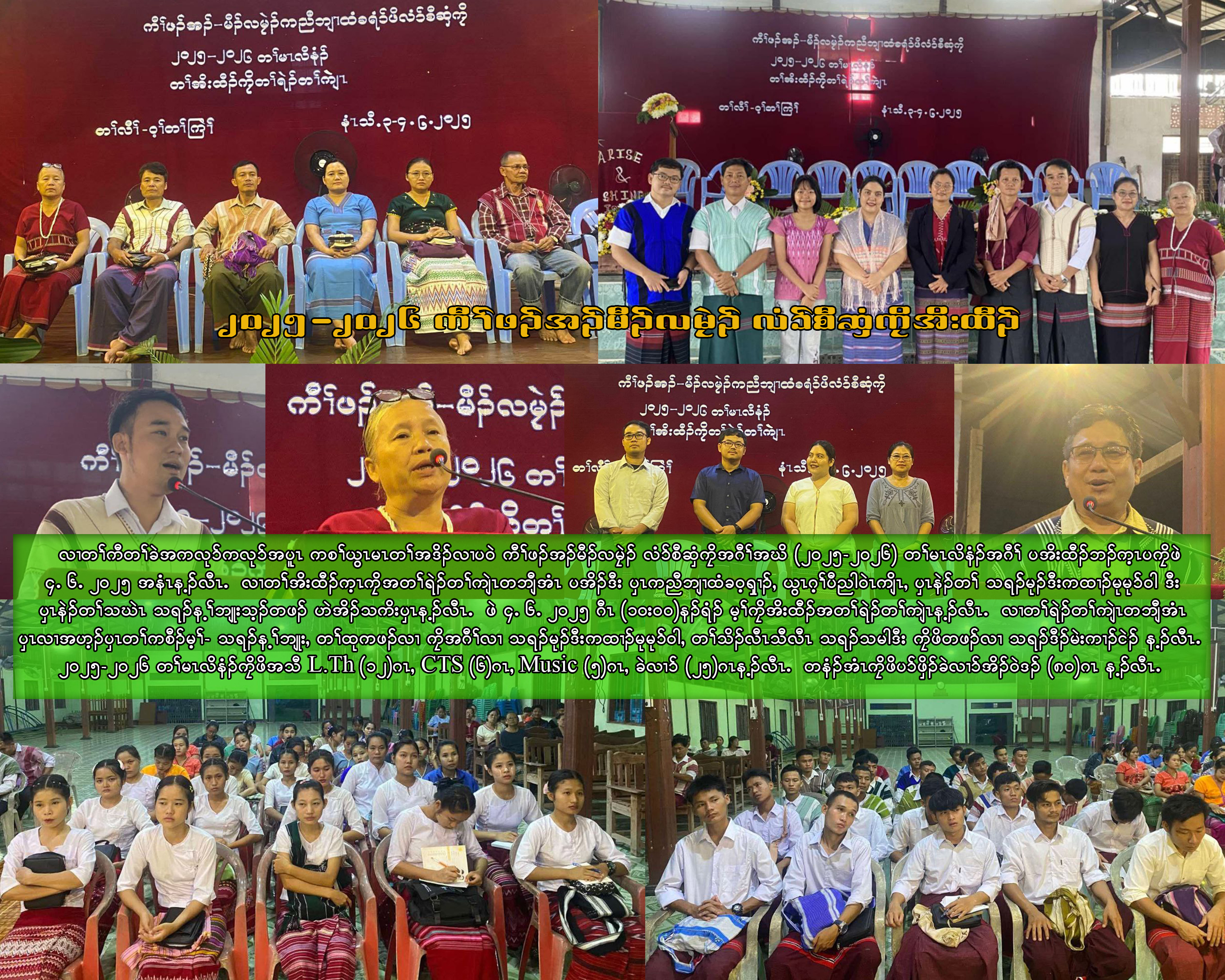 လၢတၢ်ကီတၢ်ခဲအကလု၁်ကလု၁်အပူၤ ကစၢ်ယွၤမၤတၢ်အဒိၣ်လၢပဝဲ ကီၢ်ဖၣ်အၣ်မီၣ်လမၠဲၣ် လံ၁်စီဆှံကၠိအဂီၢ်အဃိ (၂ဝ၂၅-၂ဝ၂၆) တၢ်မၤလိနံၣ်အဂီၢ် ပအိးထီၣ်ဘၣ်က့ၤပကၠိဖဲ ၄.၆.၂ဝ၂၅ အနံၤန့ၣ်လီၤ. လၢတၢ်အိးထီၣ်က့ၤကၠိအတၢ်ရဲၣ်တၢ်ကျဲၤတဘျီအံၤ ပအိၣ်ဒီး ၦၤကညီဘျၢထံခဝ့ၡၢၣ်ႇ ယွၤဂ့ၢ်ပီညါဝဲၤကျိၤႇ ၦၤနဲၣ်တၢ် သရၣ်မုၣ်ဒီးကထၢၣ်မုမု၁်ဝါ ဒီး ၦၤနဲၣ်တၢ်သဃဲၤ သရၣ်န့ၢ်ဘျုးသ့ၣ်တဖၣ် ဟဲအိၣ်သကိးၦၤန့ၣ်လီၤ. ဖဲ ၄.၆.၂ဝ၂၅ ဂီၤ (၁ဝးဝဝ)နၣ်ရံၣ် မ့ၢ်ကၠိအိးထီၣ်အတၢ်ရဲၣ်တၢ်ကျဲၤန့ၣ်လီၤ. လၢတၢ်ရဲၣ်တၢ်ကျဲၤတဘျီအံၤ ၦၤလၢအဟ့ၣ်ၦၤတၢ်ကစီၣ်မ့ၢ်- သရၣ်န့ၢ်ဘျုးႇ တၢ်ထုကဖၣ်လၢ ကၠိအဂီၢ်လၢ သရၣ်မုၣ်ဒီးကထၢၣ်မုမု၁်ဝါႇ တၢ်သိၣ်လီၤသီလီၤ သရၣ်သမါဒီး ကၠိဖိတဖၣ်လၢ သရၣ်ဒီၣ်မဲးကၢၣ်ငဲၣ် န့ၣ်လီၤ. ၂ဝ၂၅-၂ဝ၂၆ တၢ်မၤလိနံၣ်ကၠိဖိအသီ B.Th (၁၂)ဂၤႇ CTS (၆)ဂၤႇ Music (၅)ဂၤႇ ခဲလၢ၁် (၂၅)ဂၤန့ၣ်လီၤ. တနံၣ်အံၤကၠိဖိပ၁်ဖှိၣ်ခဲလၢ၁်အိၣ်ဝဲဒၣ် (၈ဝ)ဂၤ န့ၣ်လီၤ.
