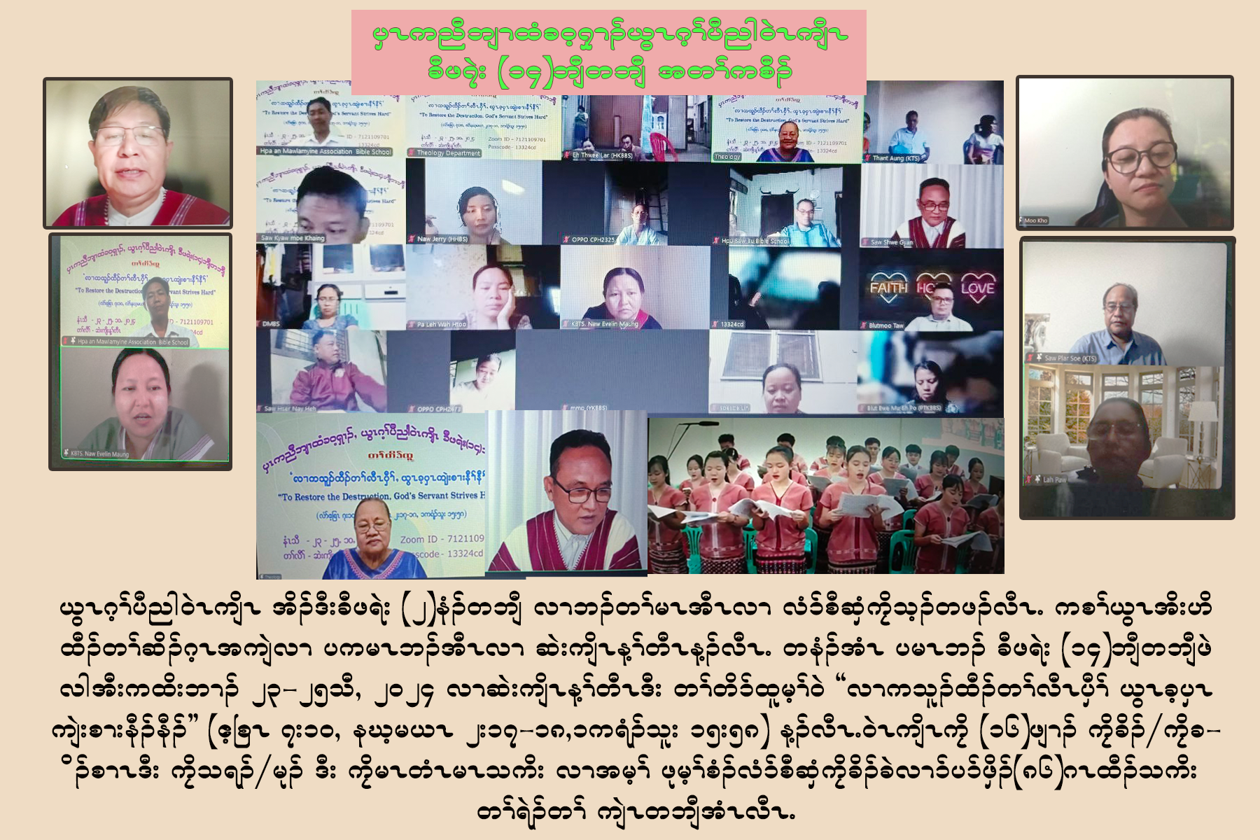ၦၤကညီဘျၢထံခ၀့ၡၢၣ်ယွၤဂ့ၢ်ပီညါ၀ဲၤကျိၤ ဒ်ခံနံၣ်တဘျီအိၣ်ဒီး တၢ်ရဲၣ်တၢ်ကျဲၤလၢအမ့ၢ် ခီဖရဲးလၢသရၣ်, သရၣ်မုၣ်တဖၣ် တၢ်ထံၣ်လိာ်ရ့လိာ်မုာ်လိာ်ဘၣ်သးဒီး မၤလိသကိးဘၣ်တၢ်အဂီၢ်န့ၣ်လီၤ.တနံၣ်အံၤ စ့ၢ်ကီးအိၣ်ဒီး ခီဖရဲး(၁၃)ဘျီတဘျီ တၢ်ရဲၣ်တၢ်ကျဲၤ ခီဖျိဆဲးကျိးန့ၢ်တီၤန့ၣ်လီၤ.တနံၣ်အံၤတၢ်တိာ်ထူမ့ၢ်၀ဲၤ- ''ဘါထုကဖၣ်တထံၣ်ဃီ, မၤထွဲယွၤကလုၢ်တီတီ"(Unceasing Pray and Faithful in the Words) မၤတၢ် ၆း၄, စီၤဒၤနံးယ့လး ၁း၈, လံာ်လီၣ်ဖျါ ၁၉း၁၃ န့ၣ်လီၤ. ခီဖရဲးအံၤ ဘၣ်တၢ်မၤအီၤလၢ(၃)သီအတီၢ်ပူၤ စးထီၣ်ဖဲ လါအီးကထိဘၢၣ်(၁၉) သီ တုၤ (၂၁)သီ, ၂၀၂၂နံၣ်န့ၣ်လီၤ. သရၣ်သိၣ်လိတၢ်တဖၣ်မ့ၢ်၀ဲ- သရၣ်ဒိၣ်ဒီးကထၢၣ်ဆၣ်မုၢ်ထီၣ်, သရၣ်ဒိၣ်ဒီးကထၢၣ်သ့ရွှ့ၣ် ဒီးသရၣ်ဒီးကထၢၣ်စီလမိၣ်အူဖ့ၣ်ထူတဖၣ်န့ၣ်လီၤ.သရၣ်သိၣ်လိလံာ်စီဆှံတဖၣ်မ့ၢ်၀ဲၤ- သရၣ်ဒိၣ်ကပီၤမူ, သရၣ်စၤလမိၣ် ဒီး သရၣ်မုၣ်ခဲးဖၢးစတံနၣ်တဖၣ်န့ၣ်လီၤ.တၢ်ရဲၣ်တၢ်ကျဲၤတၢတသီ ဘၣ်တၢ်စးထီၣ်အီၤဖဲ လါအီးကထိဘၢၣ်(၁၉)သီ,ဂီၤ(၉) နၣ်ရံၣ် ခီဖျိတၢ်ဘူၣ်တၢ်ဘါတၢ်ရဲၣ်တၢ်ကျဲၤန့ၣ်လီၤ. တၢ်ဘါကတီၢ် ၦၤပၢၤလီၢ်ဆ့ၣ်နီၤမ့ၢ်၀ဲၤ.-သရၣ်မုၣ်မူမုၢ်၀ါ (၀ဲၤကျိၤၦၤနဲၣ် တၢ်သဃဲၤ), တၢ်ကတိၤဆၢဂ့ၤ- သရၣ်ဒိၣ်ယွၤဒုးမူ(ခ၀့ၡၢၣ်နဲၣ်ရွဲၣ်), တၢ်ကတိၤတူၢ်လိာ်- သရၣ်ဒိၣ်ဟူဆၢ (၀ဲၤကျိၤ ၦၤပၢၤလီၢ်ဆ့ၣ်နီၤ), တၢ်ကစီၣ်-သရၣ်မုၣ်ဒီးကထၢၣ်လ့ထူ(နဲၣ်ရွဲၣ်သဃဲၤ), တၢ်ထုကဖၣ်-သရၣ်မုၣ်ၡံထၣ်ဖီ(ၦၤပၢၤစ့), တၢ်ကတိၤစံးဘျုး-သရၣ်မုၣ်လါဖီ (၀ဲၤကျိၤၦၤနဲၣ်တၢ်) ဒီးတၢ်ဆိၣ်ဂ့ၤပျၢ်- သရၣ်ဒိၣ်ယွၤဒုးမူ(ခ၀့ၡၢၣ်နဲၣ်ရွဲၣ်)တဖၣ် န့ၣ်လီၤ. ၀ဲၤကျိၤကၠိ(၁၄)ဖျၢၣ်ဒီး ကၠိမၤတံၤမၤသကိး(၂)ဖျၢၣ် ခၢၣ်စး, ကၠိခိၣ်တဖၣ်  ဒီးသရၣ်,သရၣ်မုၣ်သိၣ်လိတၢ်ခဲလၢာ် ပာ်ဖှိၣ်(၈၀)ဂၤ ဟဲထီၣ်သကိးခီဖရဲးတဘျီအံၤန့ၣ်လီၤ.
